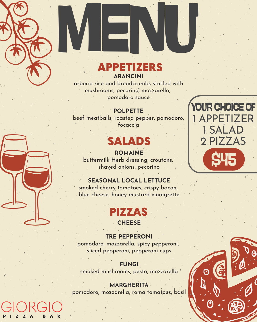 For $45, enjoy a meal that feeds 2–4 people, including: